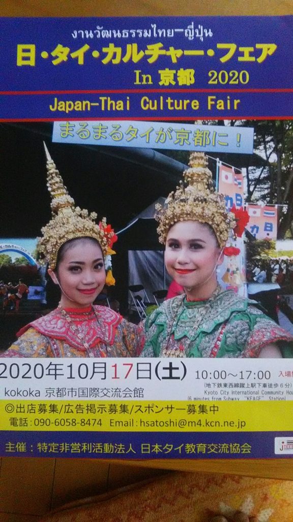 そのほかにここ4年ほどは「日・タイ・カルチャー・フェアIn 京都」を秋に開催されています。今年も計画されています。開催の際には、私もお手伝いすることになっていますが、コロナウイルスの関係で今年の開催は難しいかもしれません。